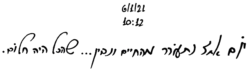 ״זה היה יולי 2019 שגיליתי בטעות מה חלמתי בפתקים של הנייד שלי…מאז שידעתי, היה לי לחץ נוראי מפנים…זה היה כה מפחיד…כי אלה דברים אישיים והרי שלא היה לי כל קשר קרוב אליך ואיך ובכלל ומאיפה אם כבר מתחילים. ניסיתי, את המוח שלי לסדר, רק אותו לנרמל…אחרי שמעט חשפתי בְּפָנֶיךָ שיש קשר ישיר למה שעובר עליי ולפטירתו של אביך, וגם משהו לא ברור, איתך ואיתי…ובאותה העת גם אני לא הבנתי בעצמי…